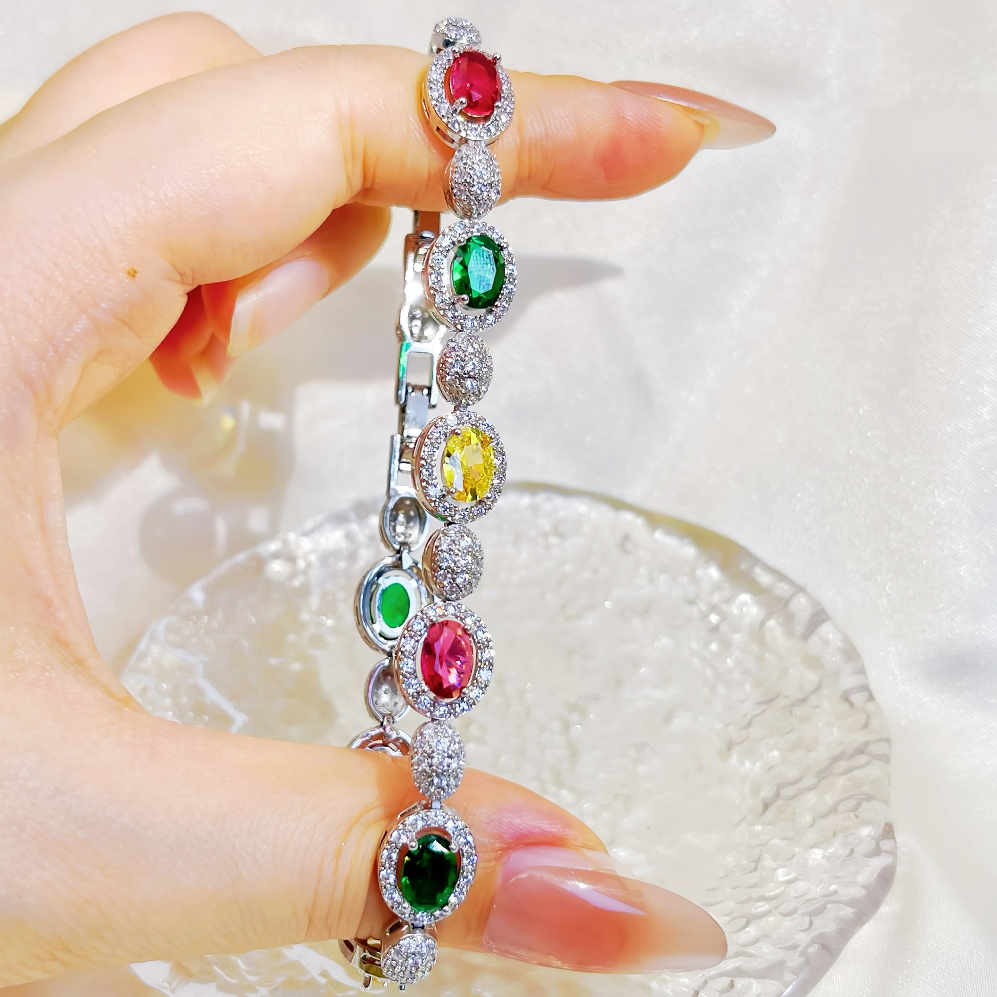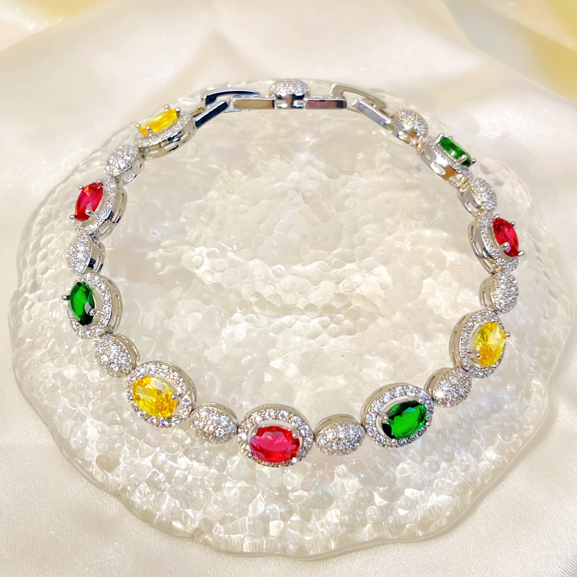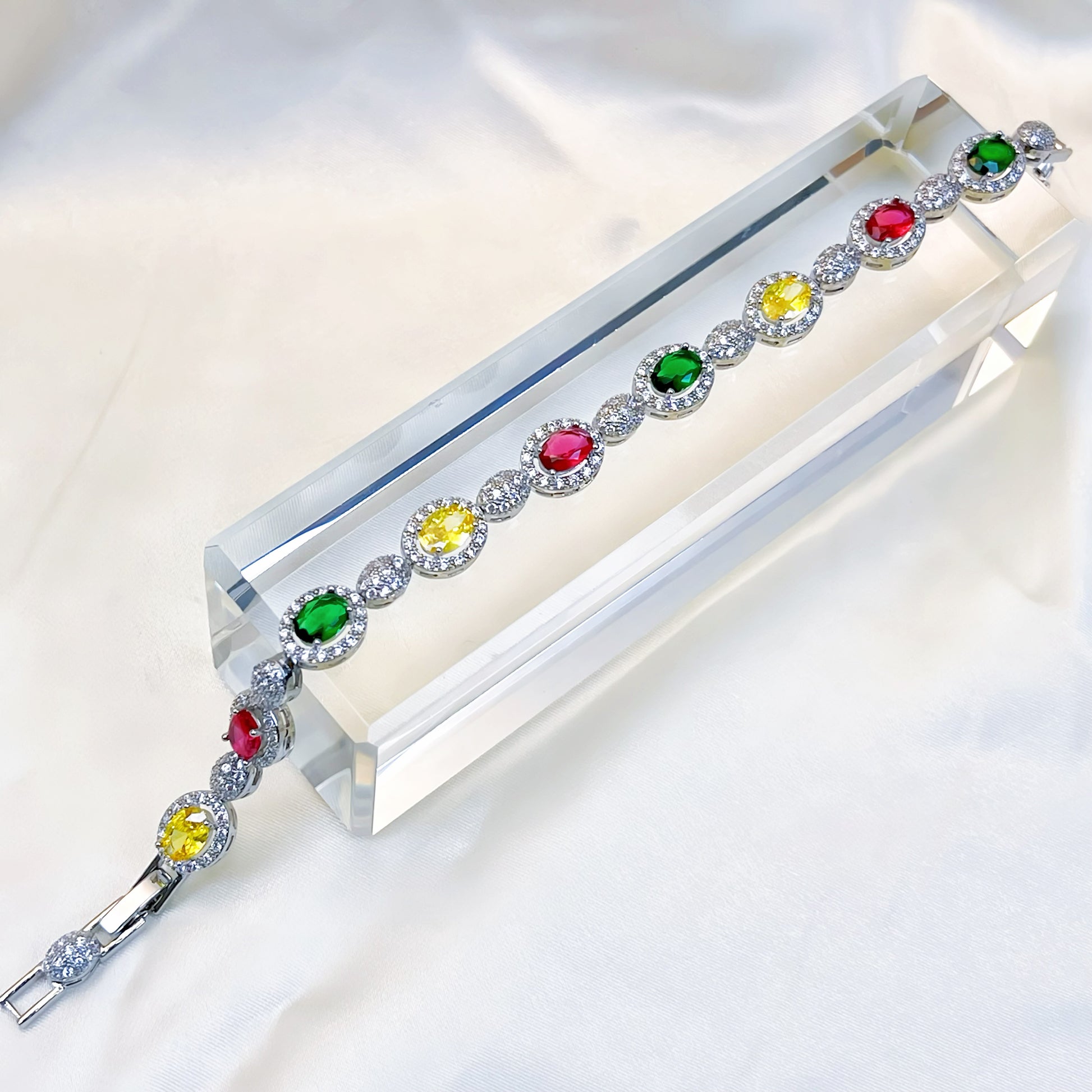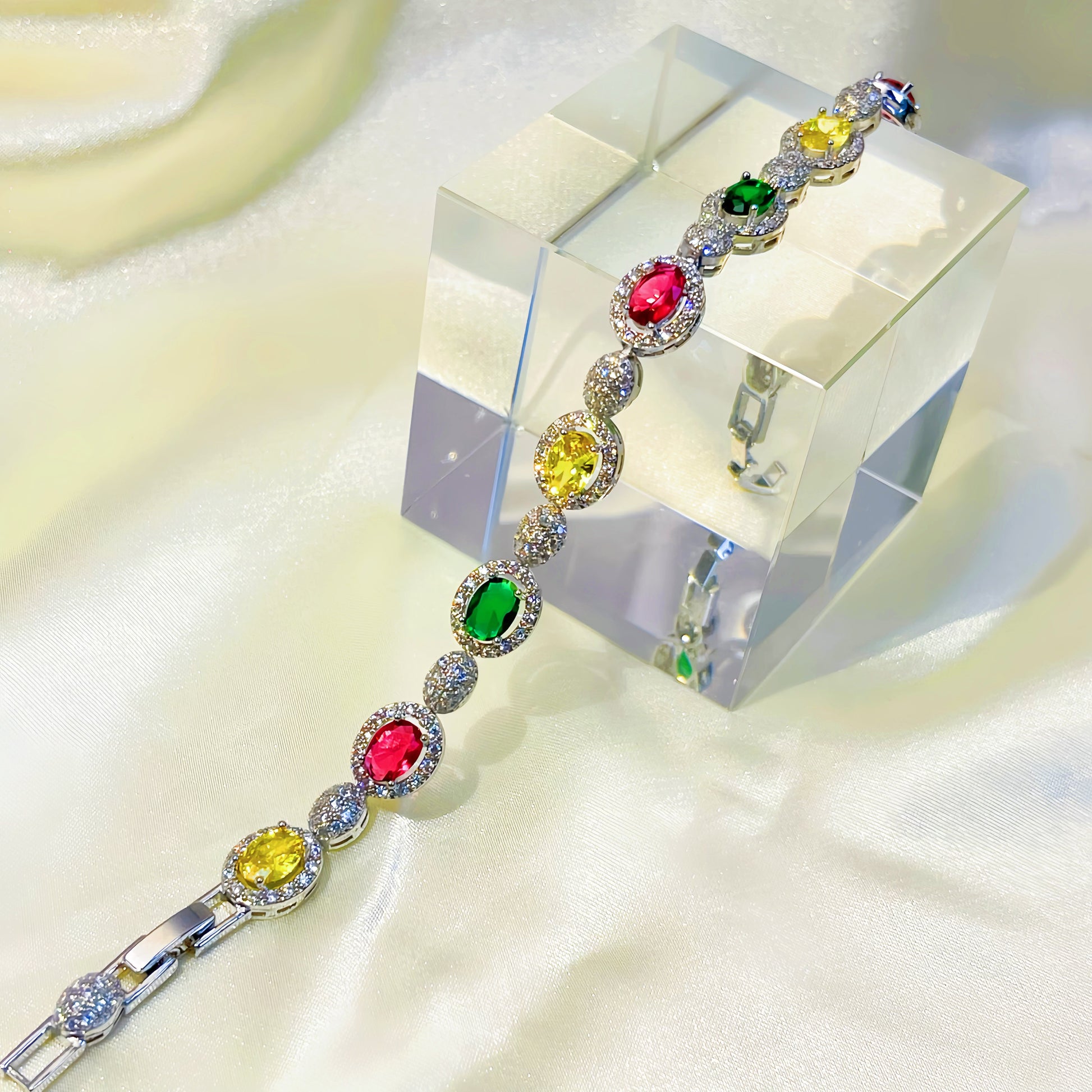 Elegantly crafted with a mix of vibrant red, yellow, and green zircon stones, this exquisite bracelet shines brilliantly.