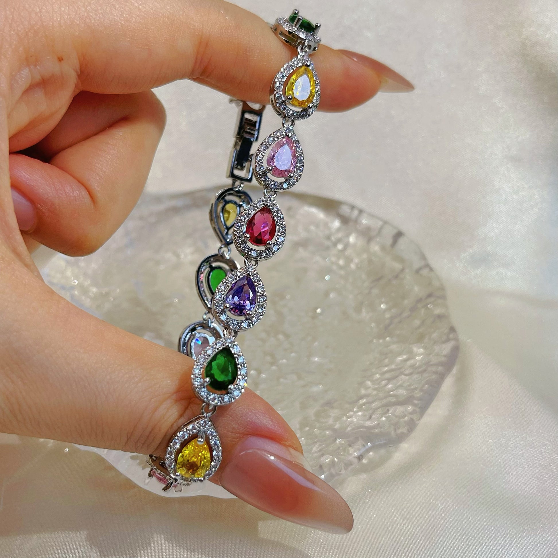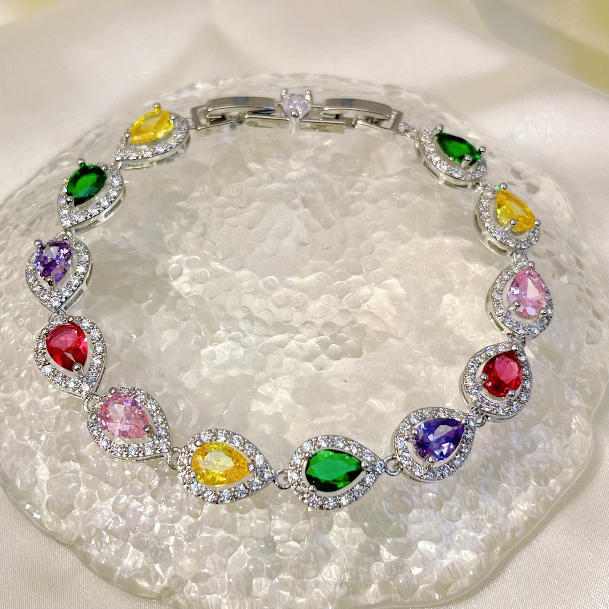 This exquisite bracelet features teardrop-shaped zircon stones in a vibrant spectrum of colors, each surrounded by dazzling micro-artifical crystal accents.