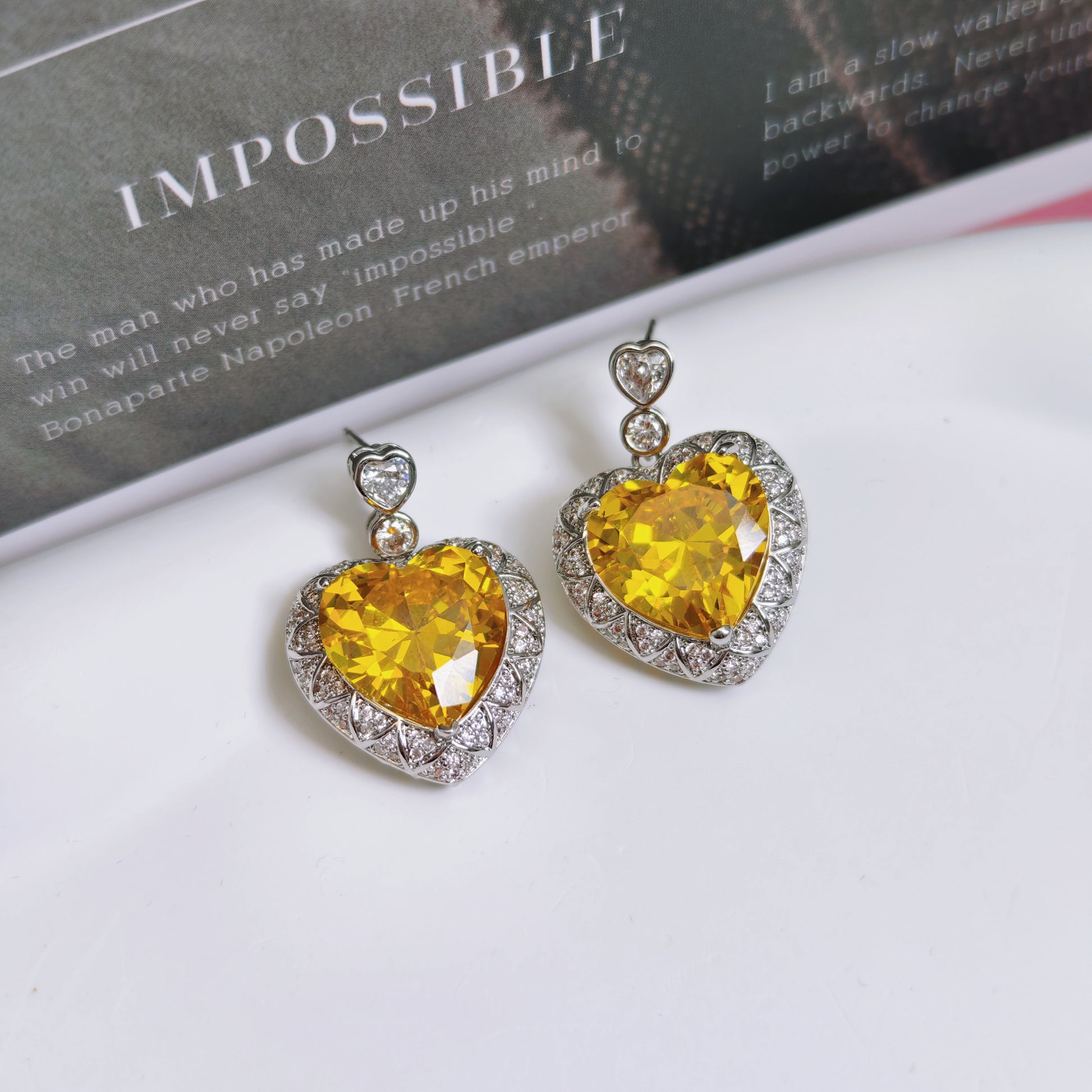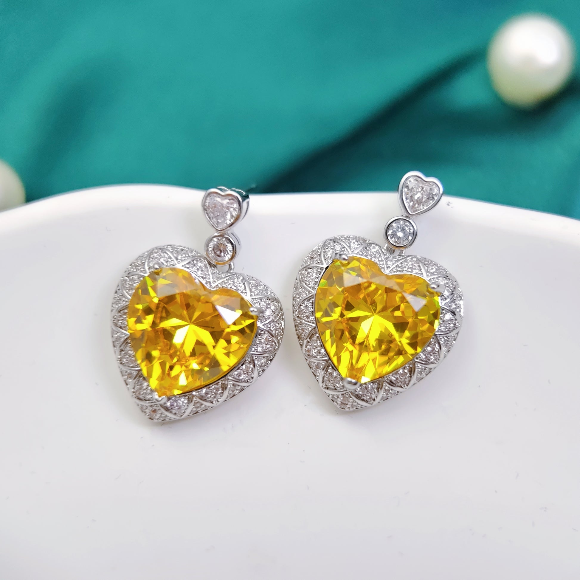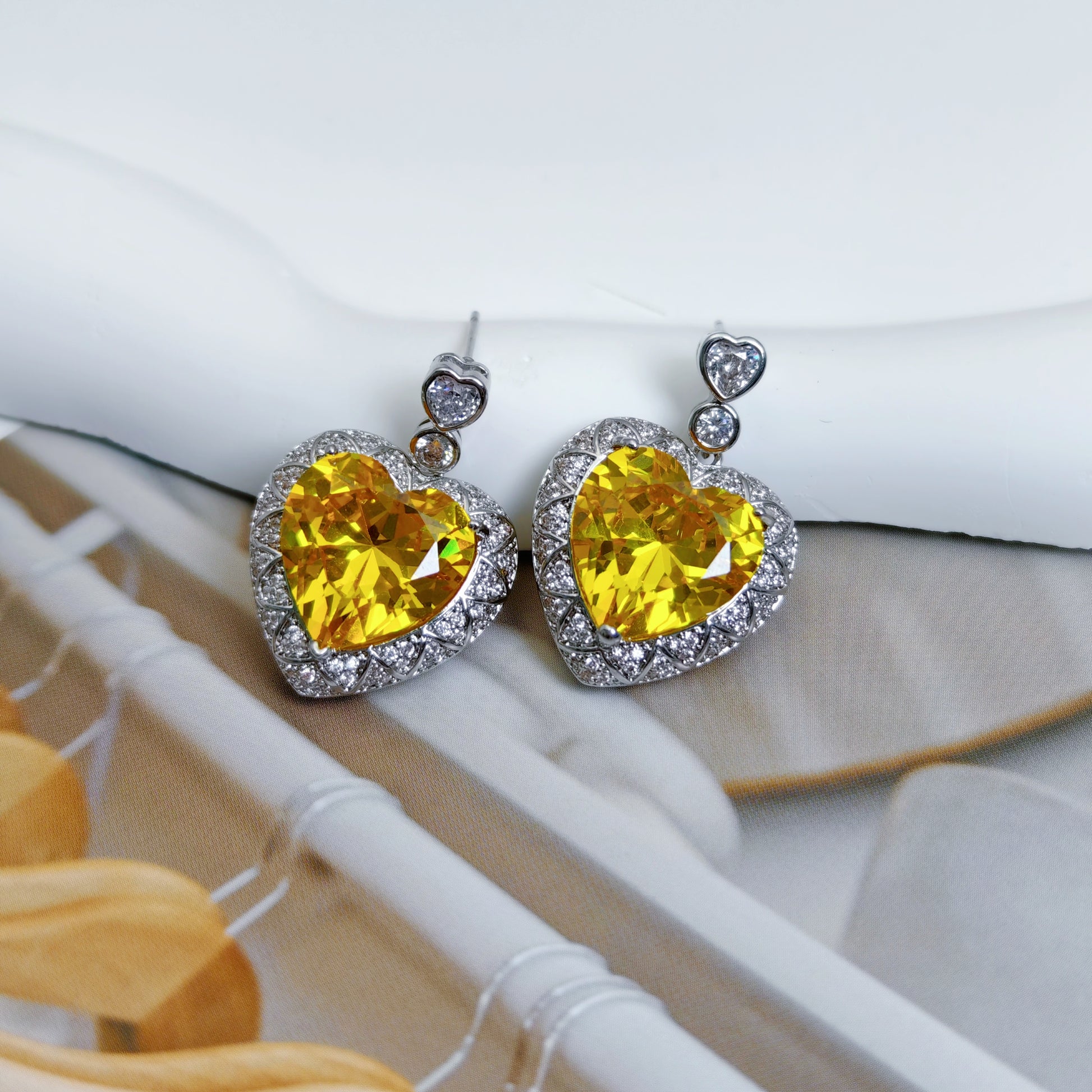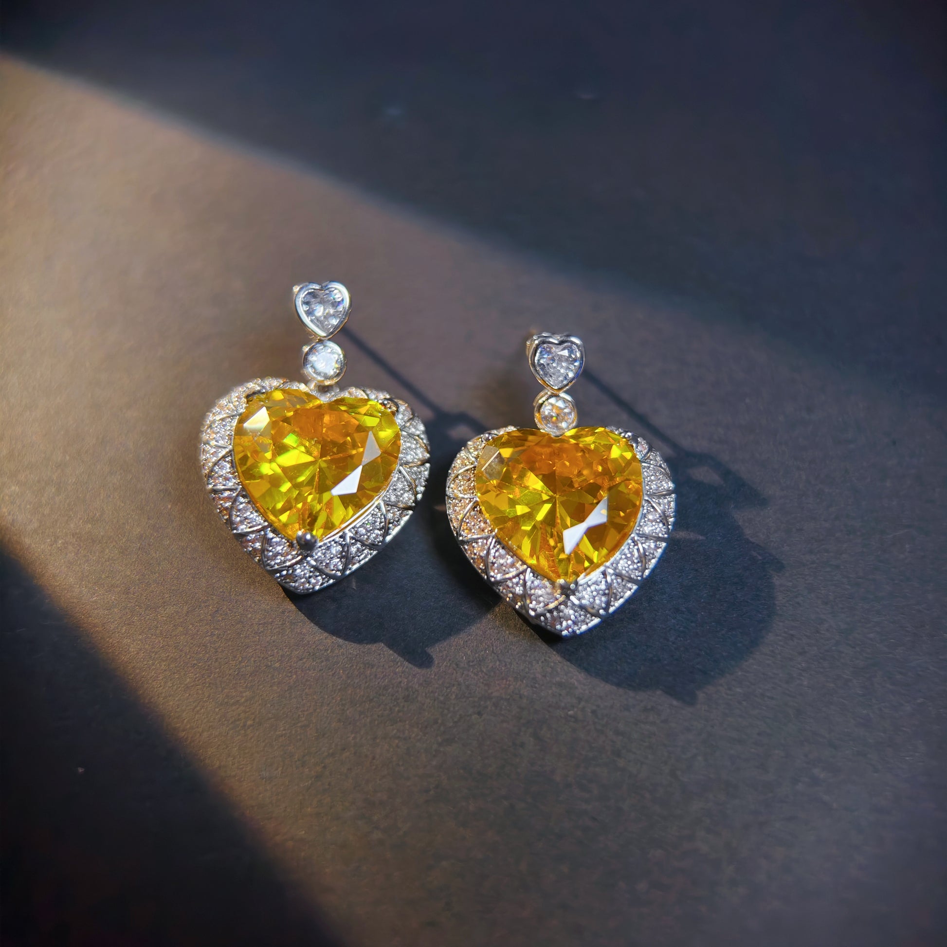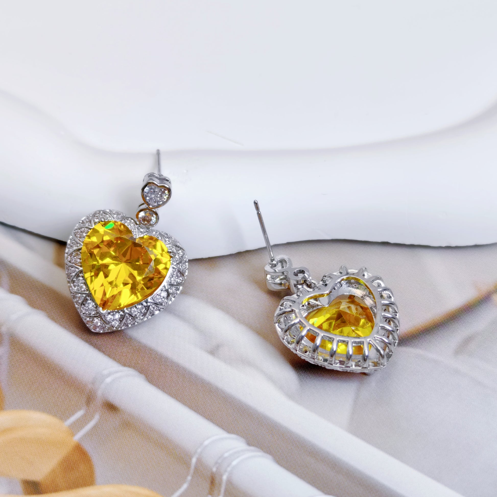 Elegantly crafted heart-shaped earrings featuring a dazzling yellow zircon stone at the center, surrounded by sparkling white ones.