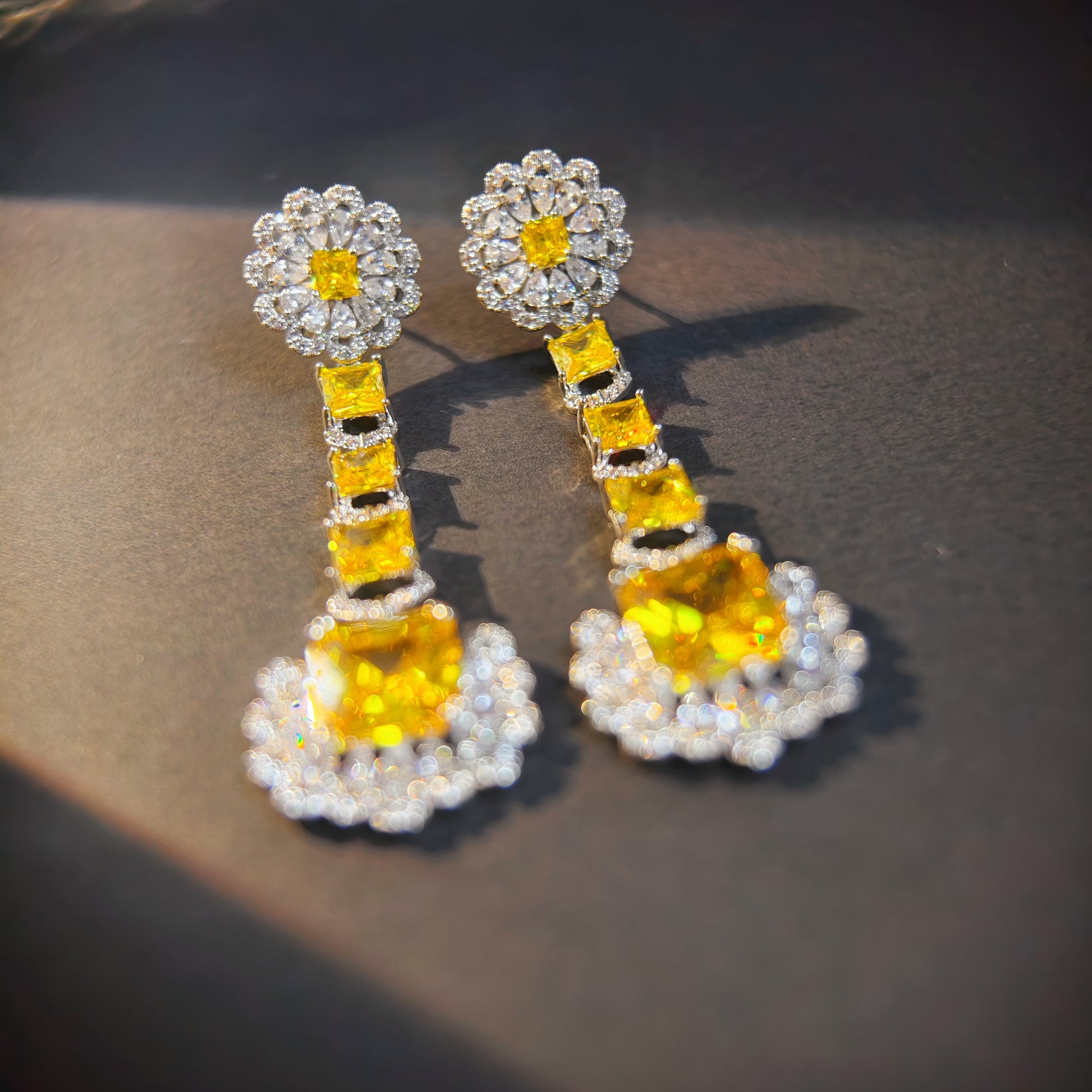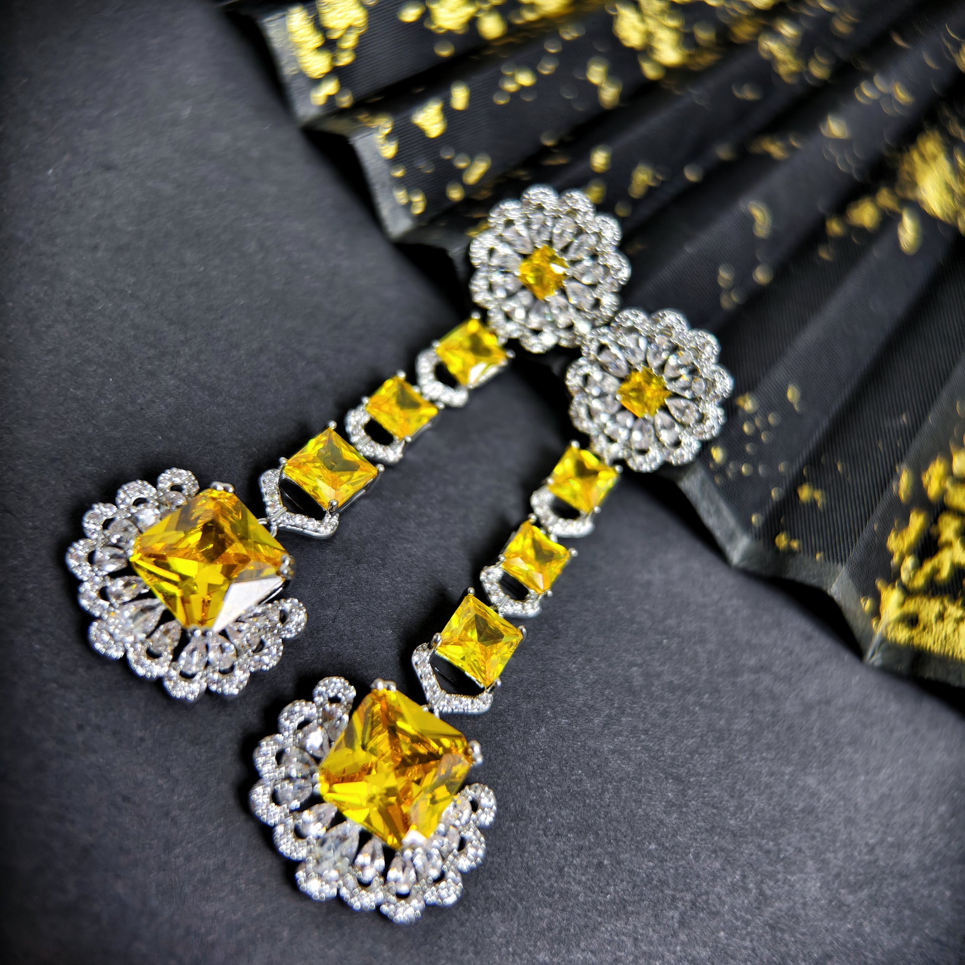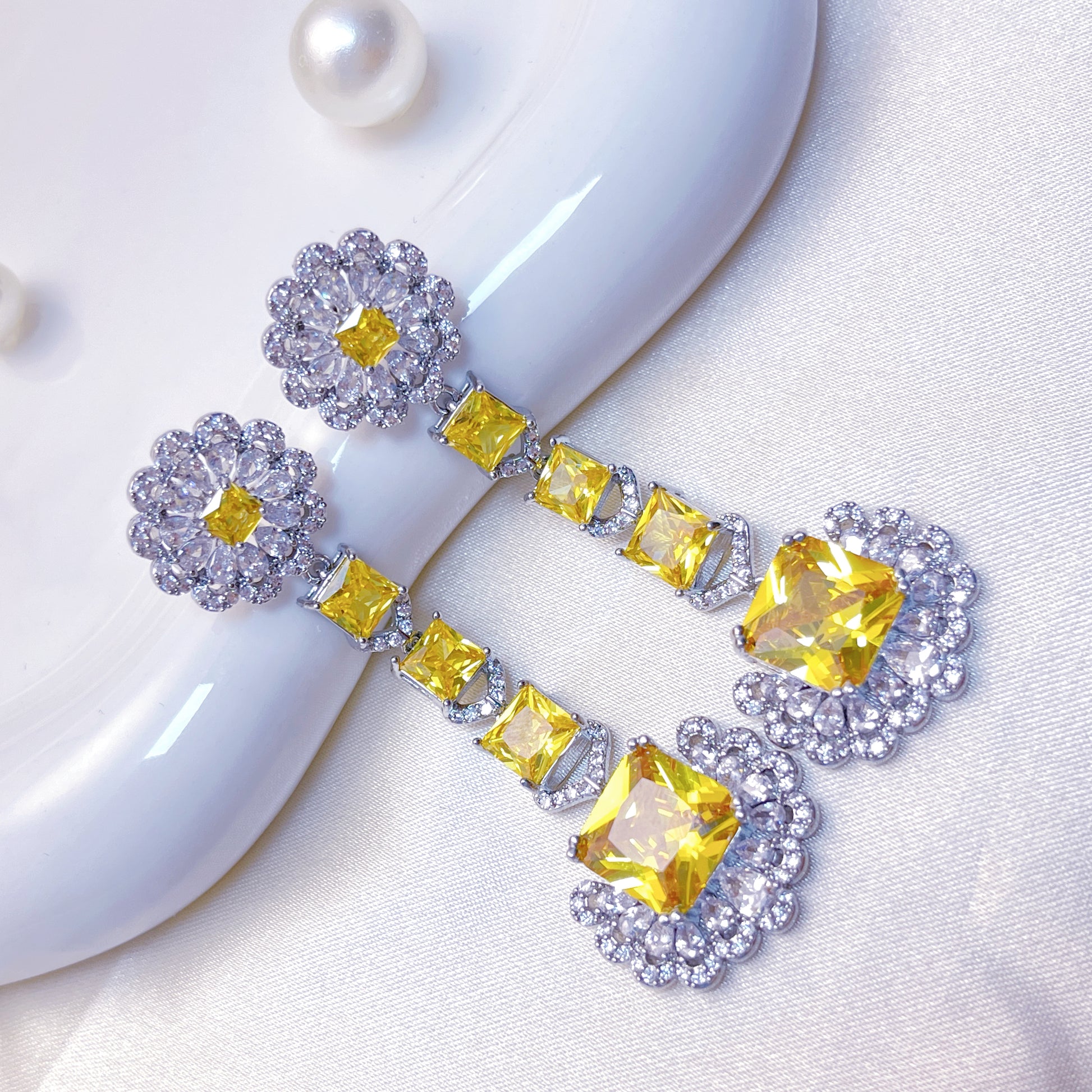 Elegant earrings showcase a floral - inspired design. Yellow zircon stones are the eye-catching centerpiece, surrounded by sparkling white zircon stones.