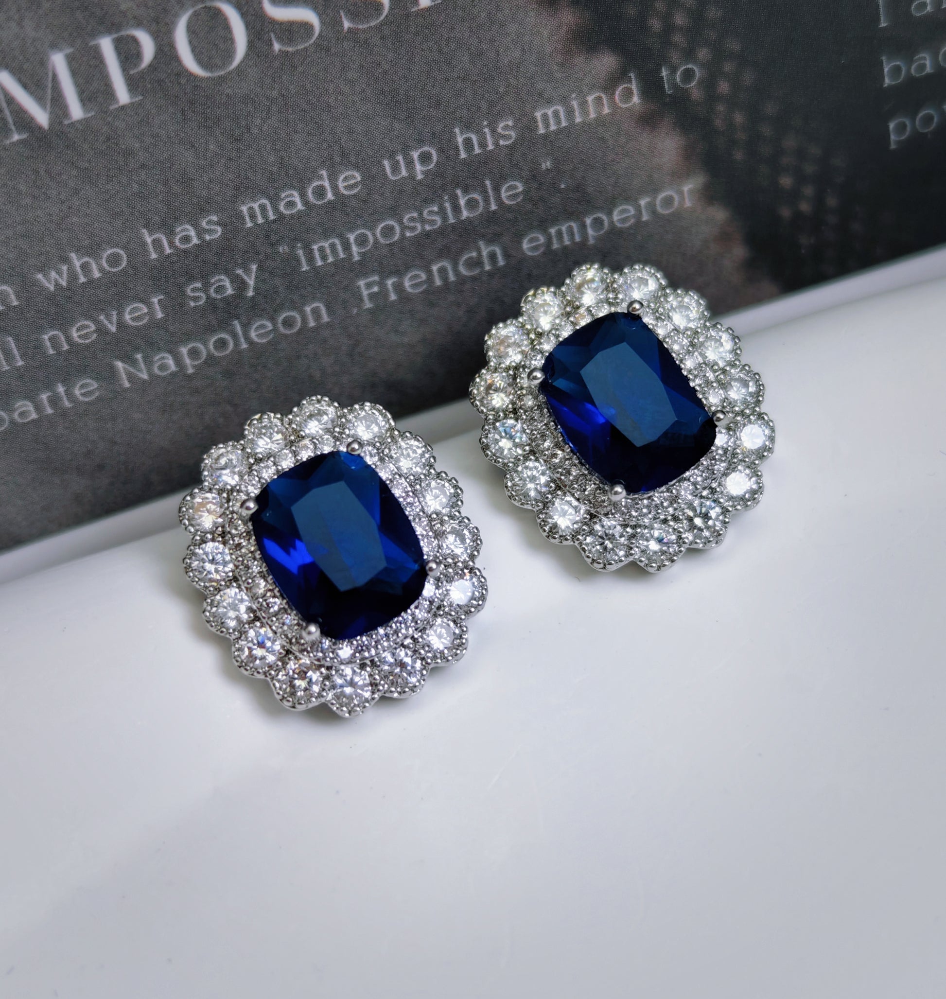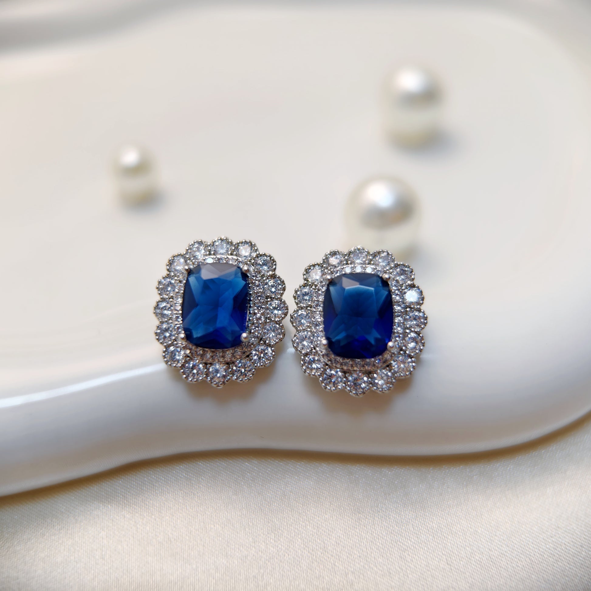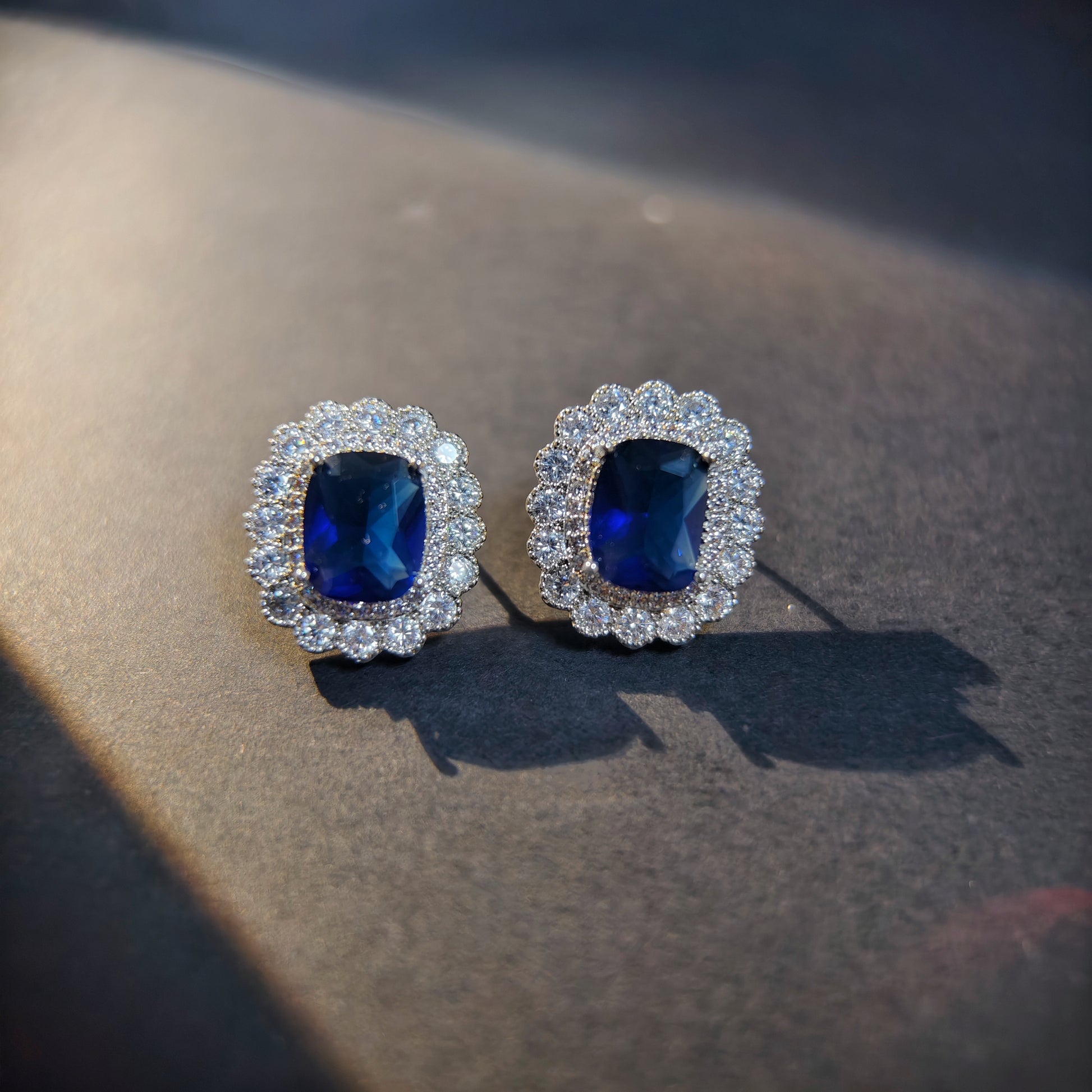 Crafted in fine silver-tone, this exquisite piece features a lustrous deep-blue zircon at its heart palce, surrounded by a halo of sparkling white zircons.